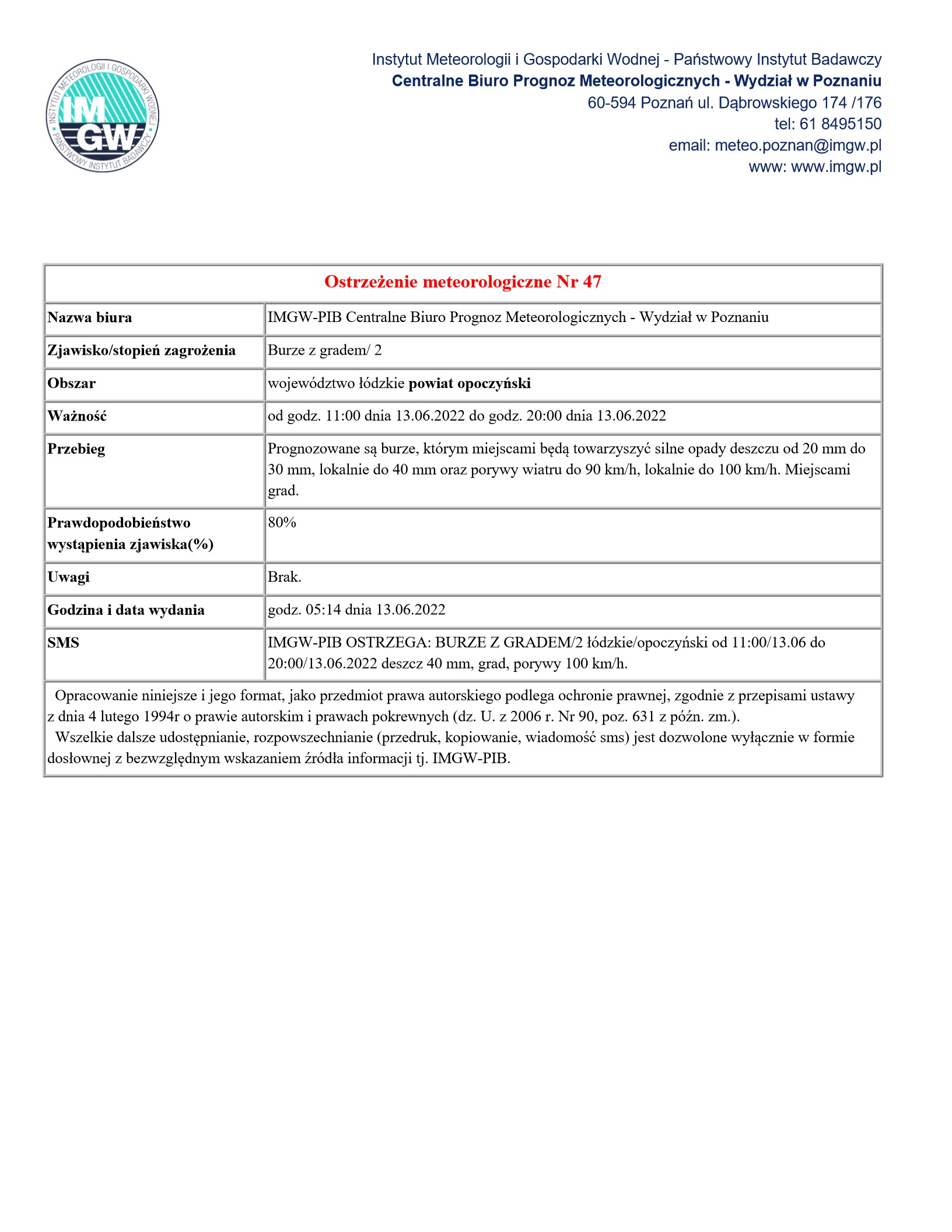 Wójt Gminy Żarnów informuje, że wydane zostało przez Instytut Meteorologii i Gospodarki Wodnej – Państwowy Instytut Badawczy Centralne Biuro Prognoz Meteorologicznych – Wydział w Poznaniu ostrzeżenie meteorologiczne 2 stopnia przed burzami z gradem dla całego województwa łódzkiego. Obowiązuje ono od godz. od godz. 11:00 dnia 13.06.2022 do godz. 20:00 dnia 13.06.2022 roku. Prognozowane są burze, którym miejscami będą towarzyszyć silne opady deszczu od 20 mm do 30 mm, lokalnie do 40 mm oraz porywy wiatru do 90 km/h, lokalnie do 100 km/h. Miejscami grad.