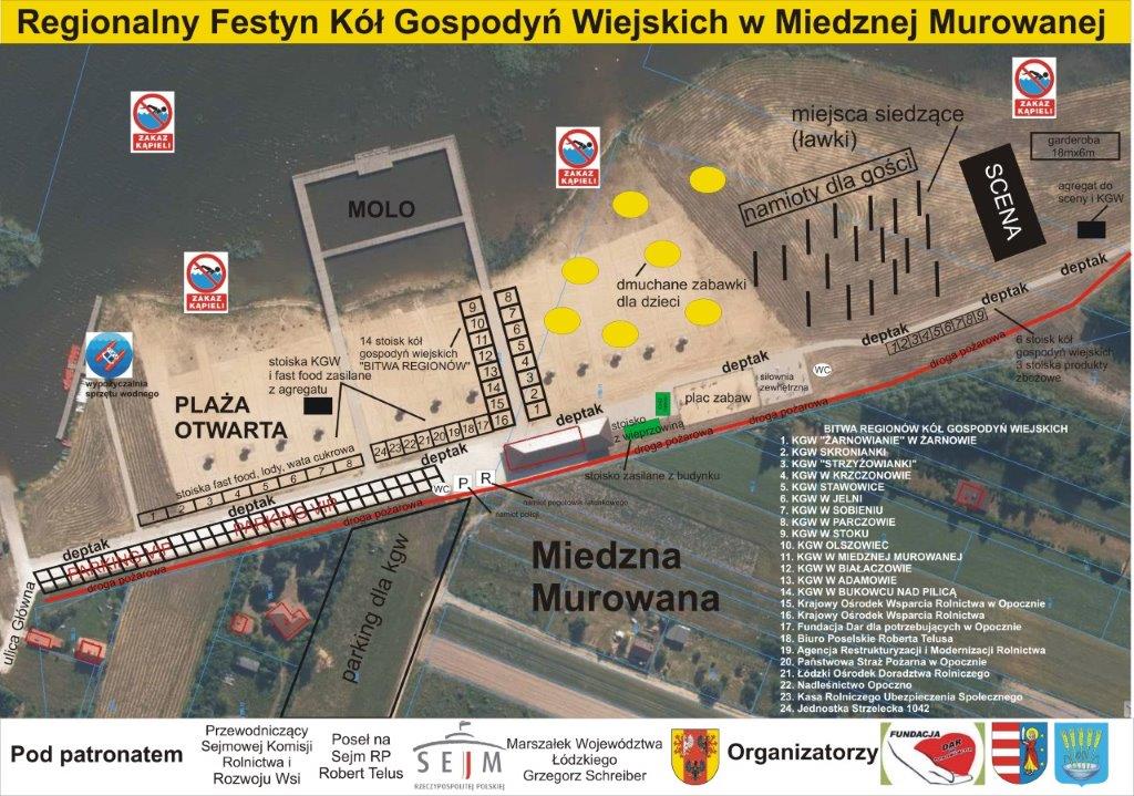W załączniku – plakat promocyjny i mapa części Ośrodka Sportu i Rekreacji w Miedznej Murowanej, m.in. z zaznaczonymi miejscami dla kół gospodyń wiejskich, wystawców i miejscami parkingowymi.