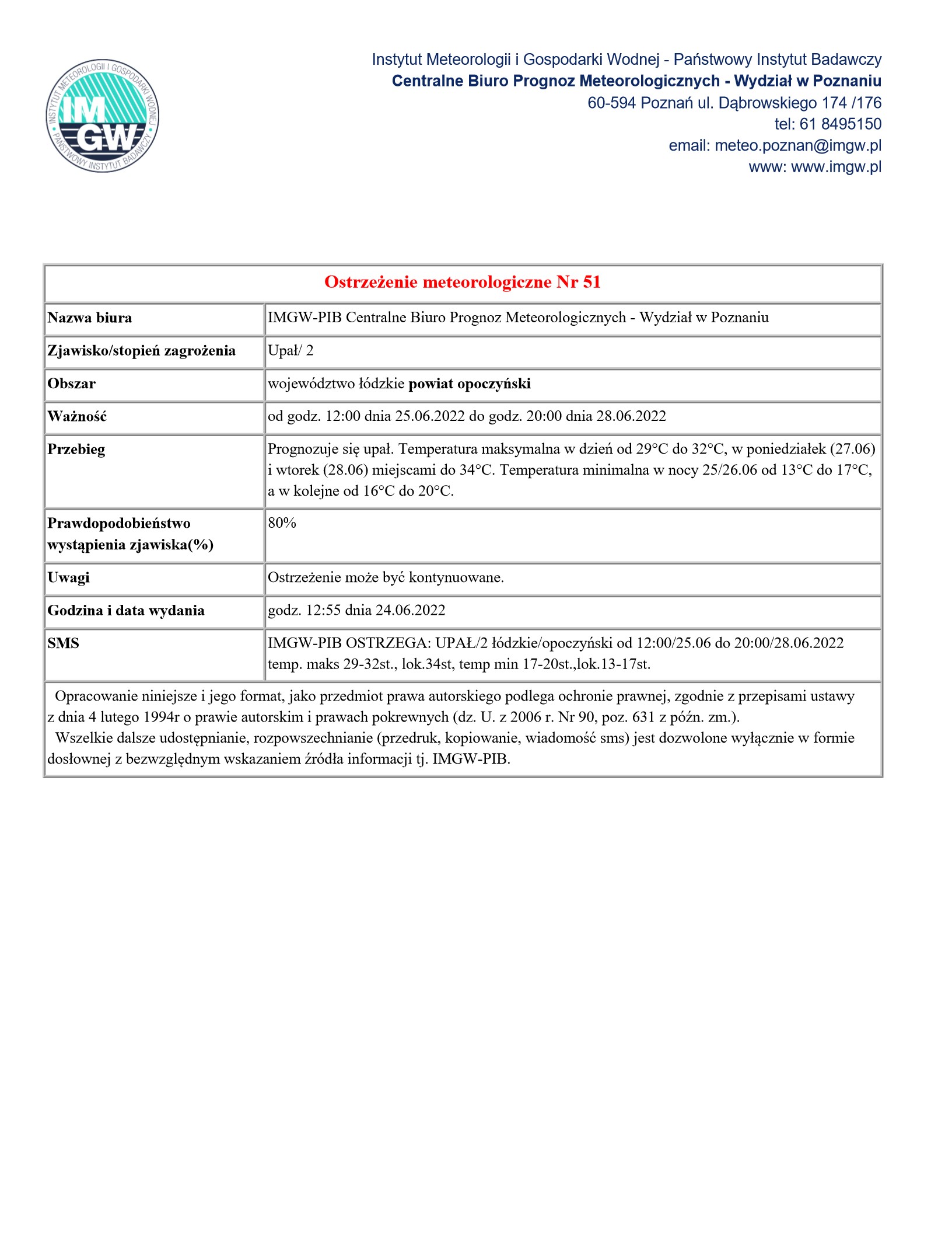 IMGW-PIB Biuro Prognoz Meteorologicznych w Poznaniu ostrzega przed wysokimi temperaturami powyżej 30°C na terenie województwa łódzkiego (powiat opoczyński) od godz. 12:00 dnia 25.06.2022 do godz. 20:00 dnia 28.06.2022 roku.