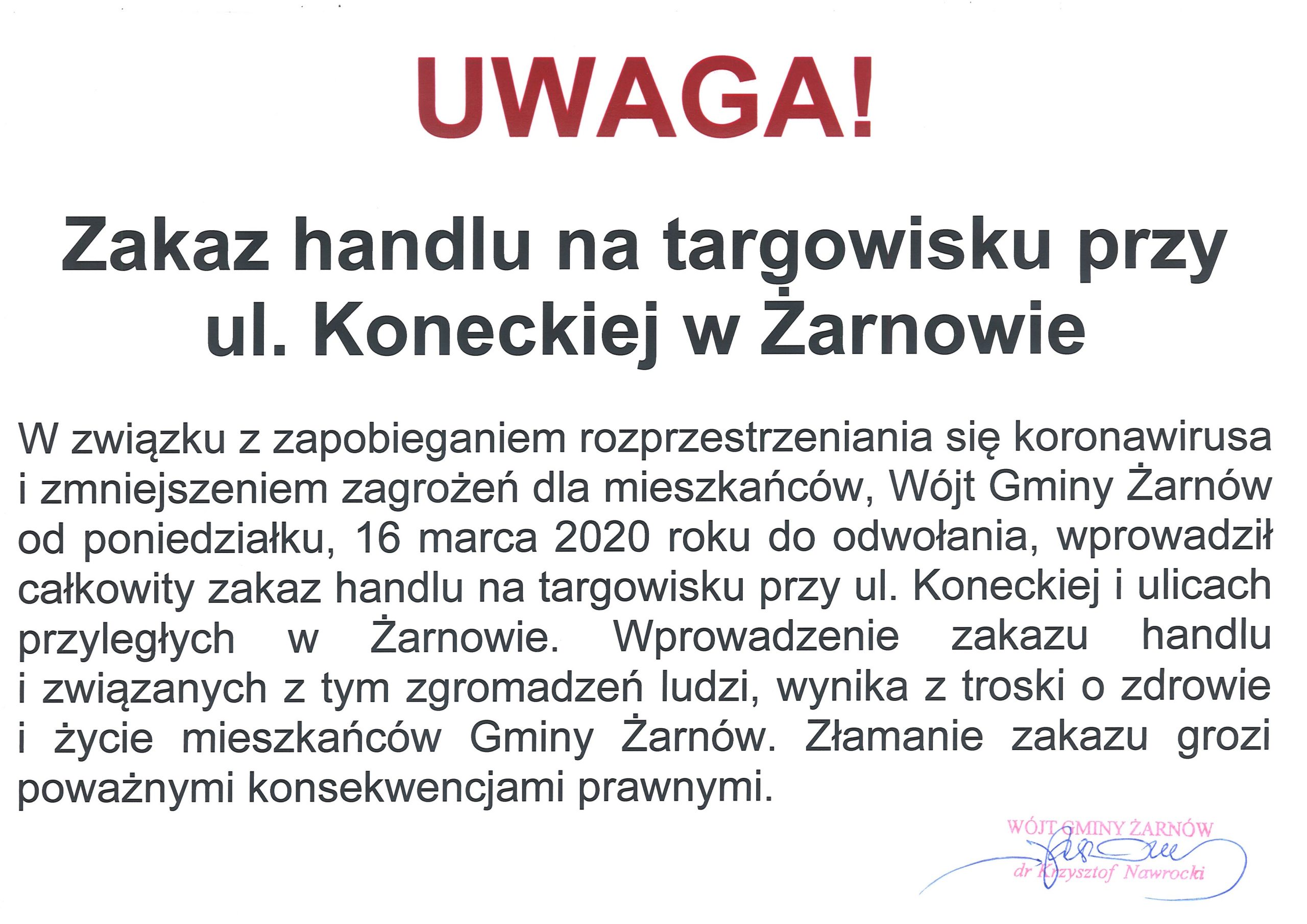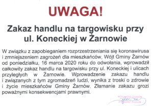 W związku z zapobieganiem rozprzestrzeniania się koronawirusa i zmniejszeniem zagrożeń dla mieszkańców, Wójt Gminy Żarnów od poniedziałku, 16 marca 2020 roku do odwołania, wprowadził całkowity zakaz handlu na targowisku przy ul. Koneckiej i ulicach przyległych w Żarnowie. Wprowadzenie zakazu handlu i związanych z tym zgromadzeń ludzi, wynika z troski o zdrowie i życie mieszkańców Gminy Żarnów. Złamanie zakazu grozi poważnymi konsekwencjami prawnymi.